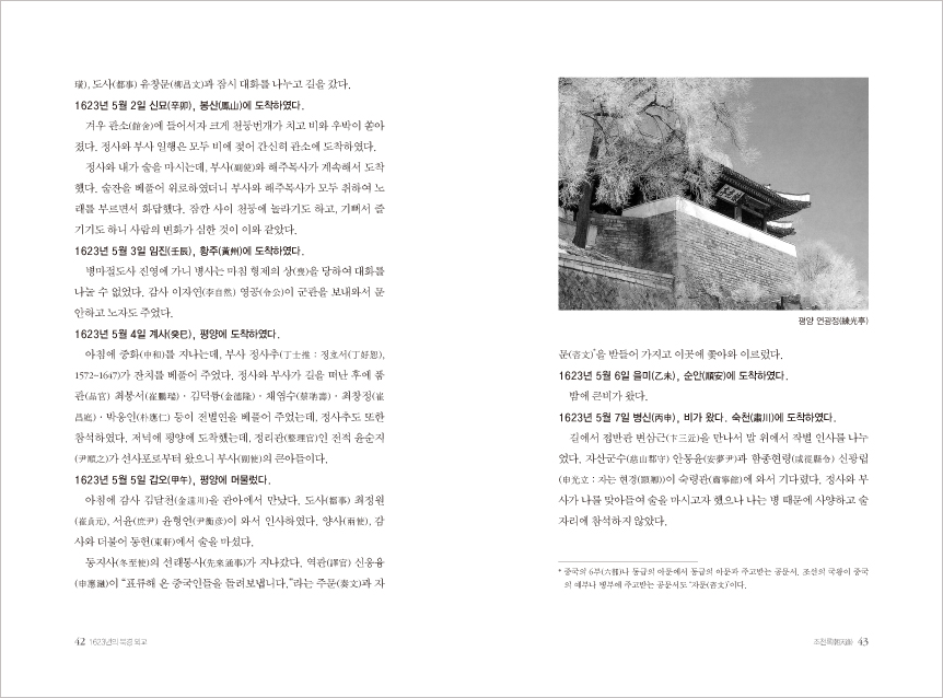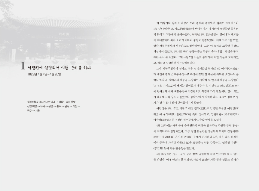 ÀÌ Ã¥Àº 1623³â 3¿ù, ÀÎÁ¶¹ÝÁ¤ ÈÄ ¸í³ª¶ó¿¡ ÀÎÁ¶ Ã¥ºÀÀ» ¿äûÇϱâ À§ÇÏ¿© »ç½ÅÀ¸·Î °¬´ø À̹μº(ì°ÚÅàô) ÀÏÇàÀÇ ¿©Çà °ß¹®°ú ºÏ°æ¿¡¼­ÀÇ È°µ¿À» ±â·ÏÇÑ Àϱ⠡¸Á¶Ãµ·Ï(ðÈô¸Öâ)¡¹ÀÇ ±¹¿ªº»ÀÌ´Ù.
